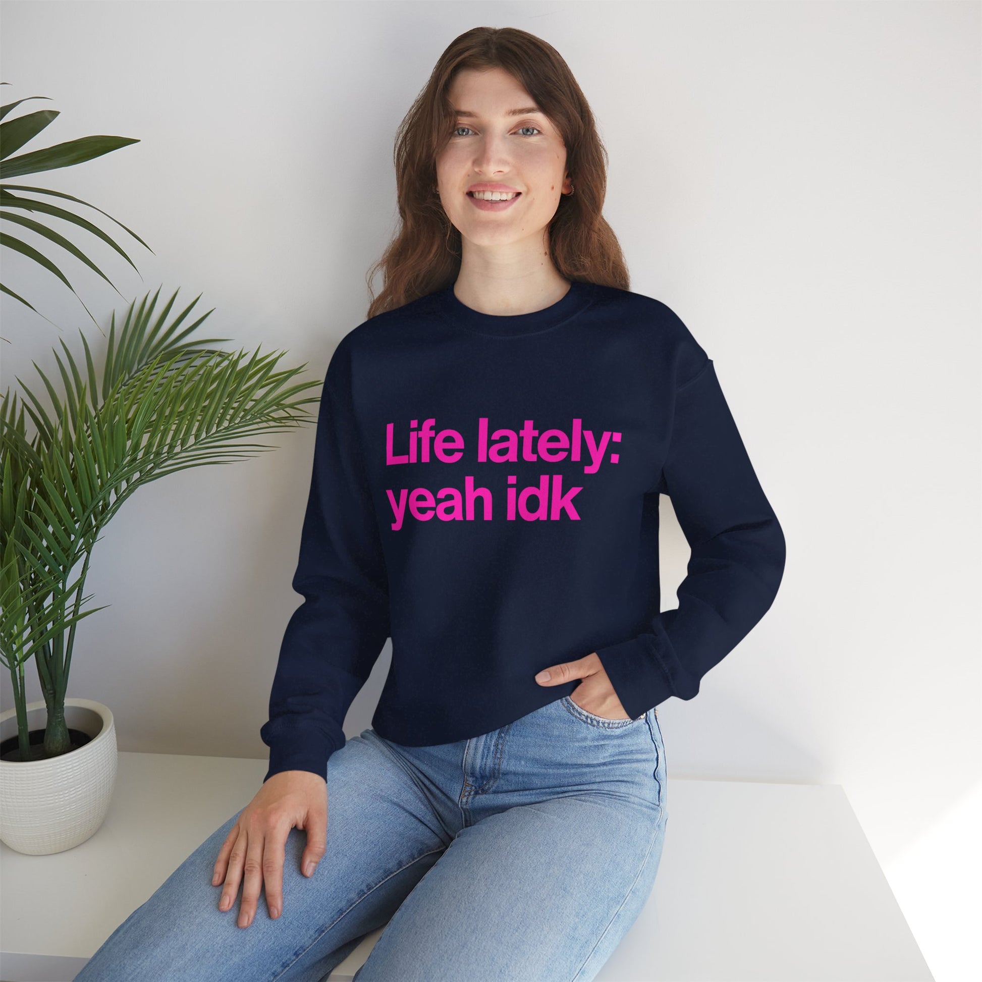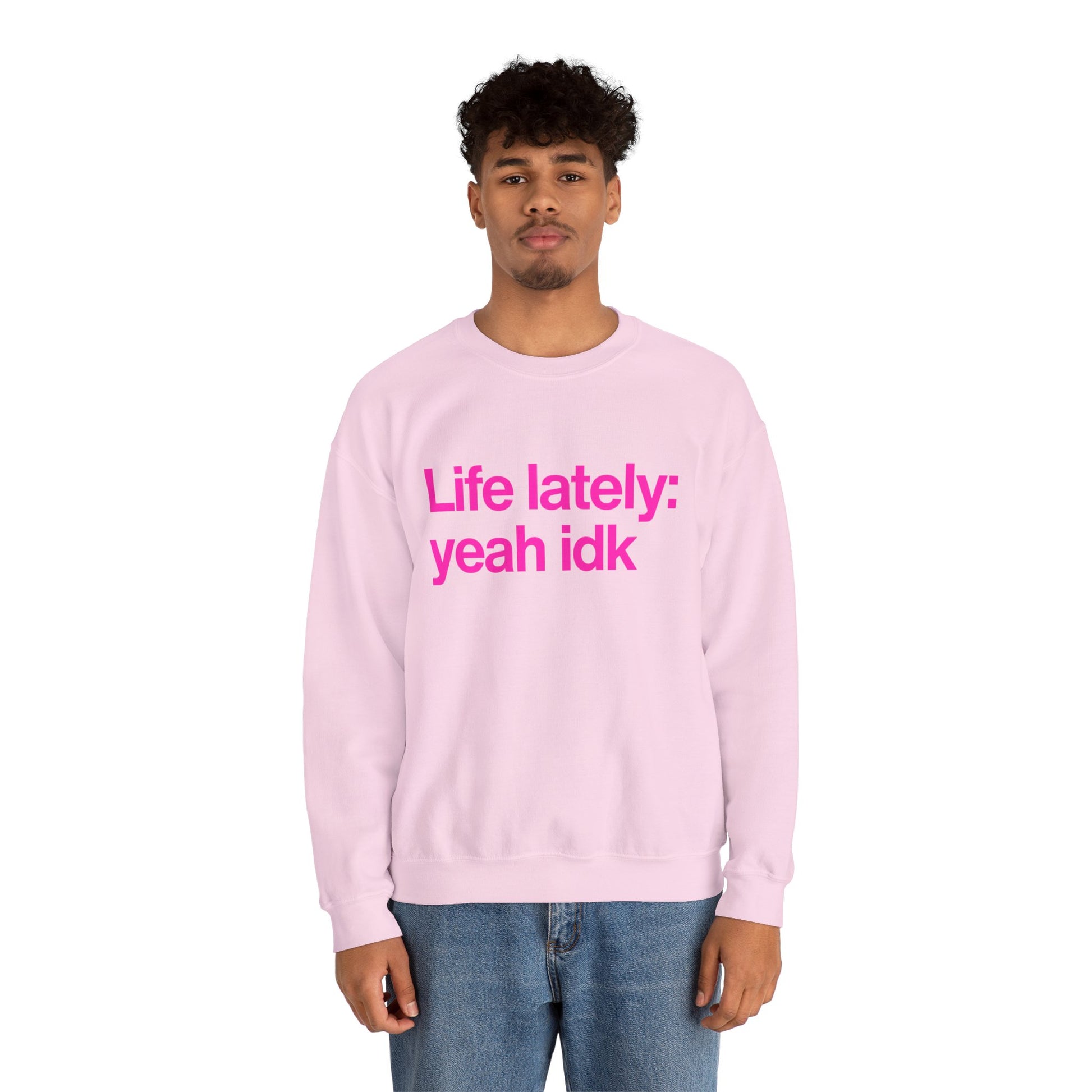 Crewneck Sweatshirt - "Life lately: yeah idk" Pink Text Casual Pullover